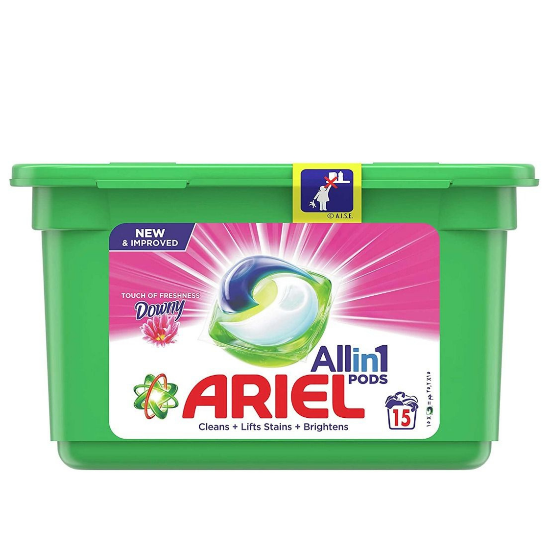 Ariel pods contain the right amount of detergent in a pre-dosed capsule. Ariel liquid pods clean, lift stains, and brightens all-in-one pods. Powerful stain removal in 1 wash. Enjoy the pleasant touch of Downy's freshness on your laundry.